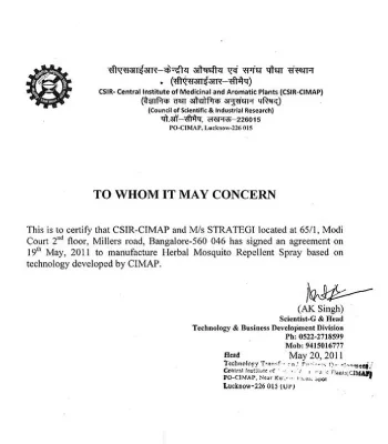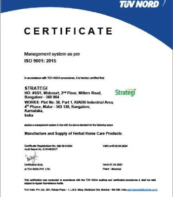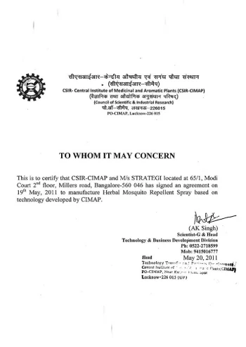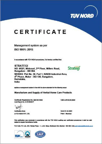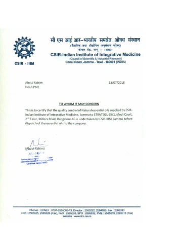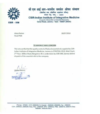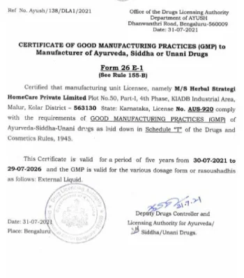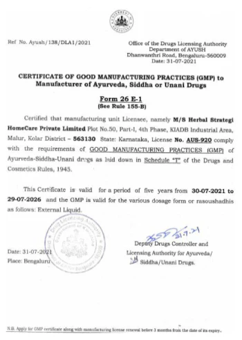 We have the following certifications : GMP, AYUSH, GREENPRO, PETA, Quality Control of Natural ingredients by CSIR-IIIM, J&K. Min. of Science & Tech .Govt. of India & Tech. From CSIR-CIMAP Min. of Science & Tech.Govt.ofIndia. , ISO 9001:2015