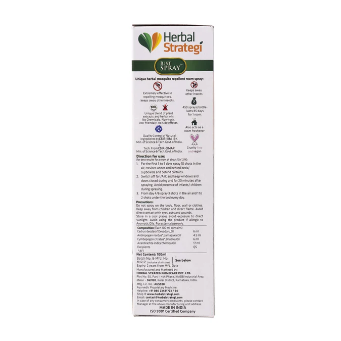 • Completely Herbal: Herbal Strategi’s Just Spray is completely made from plant-based essential oils like Lemongrass, Citronella Oil, Cedarwood Oil & Neem Oil which are known to have mosquito repellent properties.